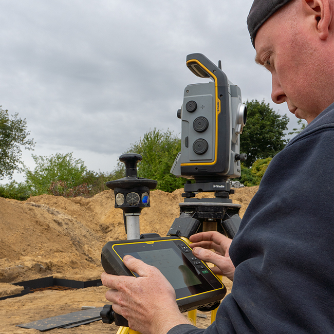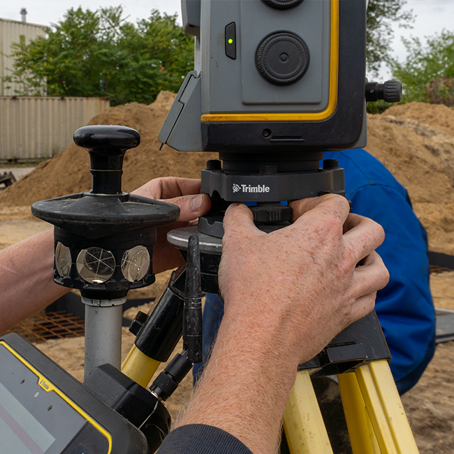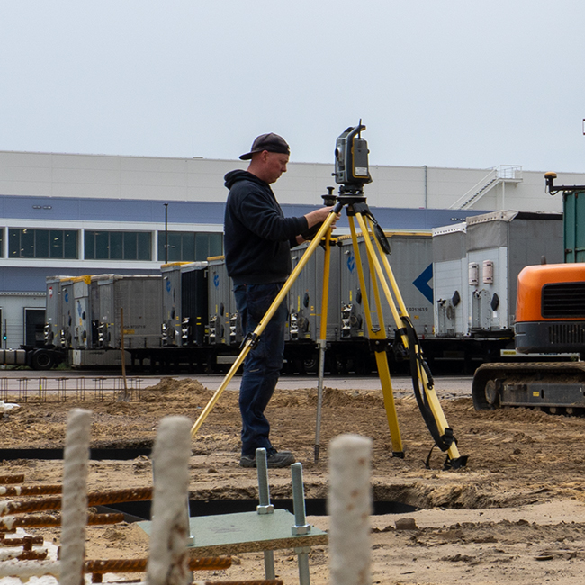 Op de bouw zelf zetten we de constructie digitaal uit met een geavanceerd totalstation. Zo worden assen en maatvoeringen tot op de millimeter nauwkeurig bepaald en voorkomen we afwijkingen tijdens de montage.
